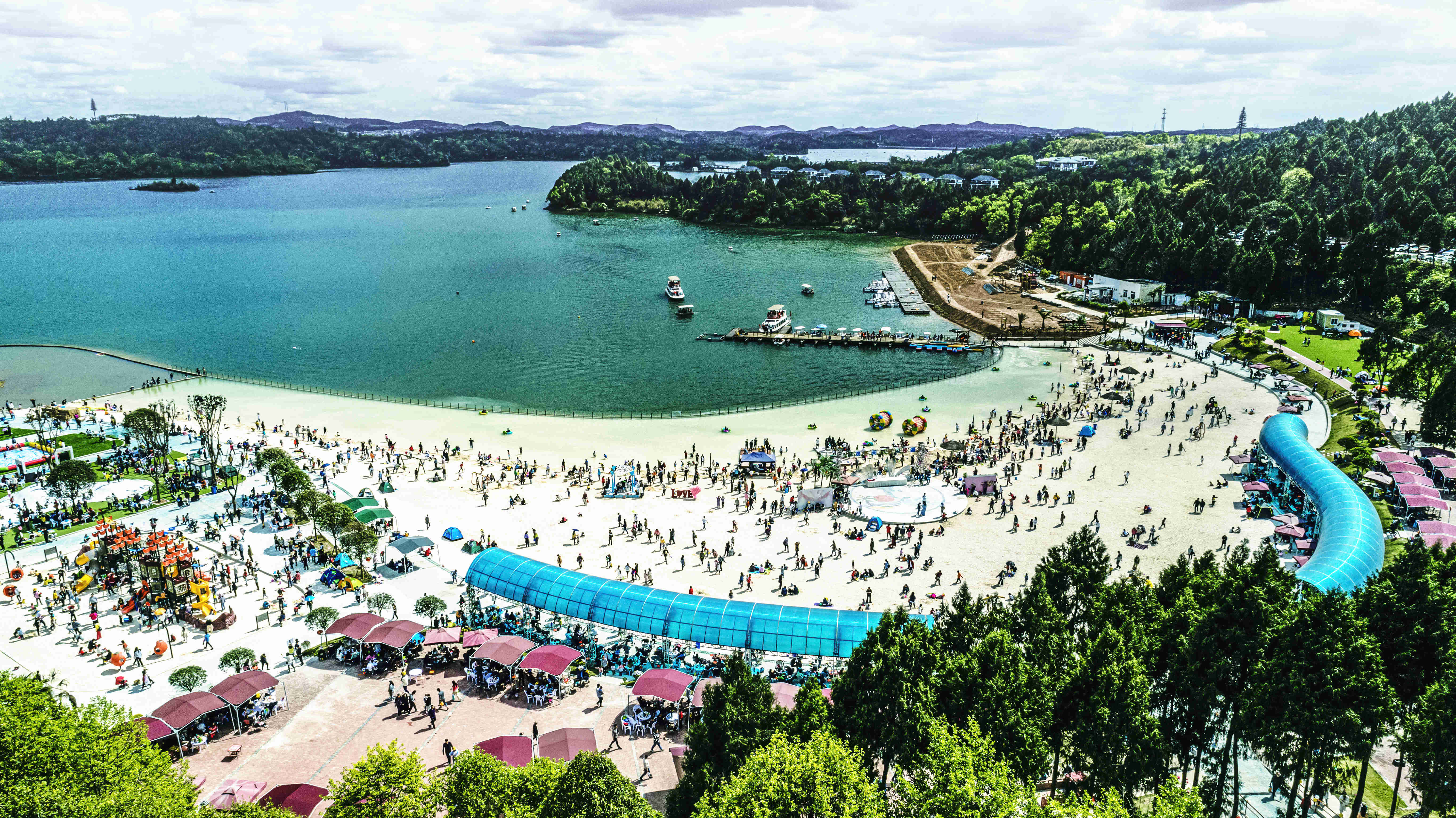 綿陽嘉成文化旅游有限公司是一家旅游開發(fā)公司,成立于2019年。 親水灣沙灘樂園項目由綿陽嘉成文化旅游有限公司開發(fā)運(yùn)營,位于國家級水利風(fēng)景區(qū)——綿陽市仙海水利風(fēng)景區(qū),距綿陽市區(qū)15公里,車程約半個小時,是依托沉抗水庫建設(shè)的仙海風(fēng)景區(qū)重點(diǎn)旅游項目。進(jìn)入仙海風(fēng)景區(qū)上坡向左進(jìn)入環(huán)湖路前行1000米。項目總占地220畝,其中核心沙灘樂園占地100畝,現(xiàn)建成沙灘休閑、淺灘嬉水、水上運(yùn)動,親子蹦蹦云、網(wǎng)紅多人秋千、人力過山車、水幕秋千、團(tuán)隊拓展等項目十余個,還開設(shè)有特色中餐、仙海火鍋魚,自助燒烤等飲食項目。 近觀青山綠水,遠(yuǎn)眺碧波蕩漾,清晨朝霞映翠、傍晚水天一色。親水灣沙灘主題樂園有可容納200人的沙灘會議室和30人的小型會議室;棋牌室16間; 商務(wù)KTV;餐飲中心可同時容納300人用餐;篝火晚會場地等,是婚禮壽宴、同學(xué)聚會、餐飲娛樂、商務(wù)會議、拓展培訓(xùn)、家庭親子活動的首選之地。